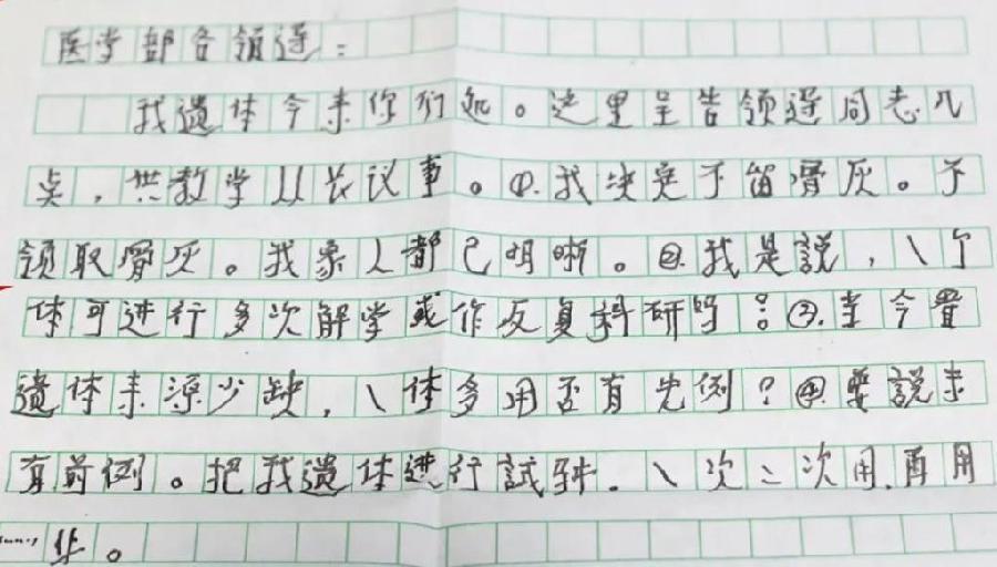 在完成捐献遗体登记时手写的后事录上,李宝金郑重写下,同意对自己的遗体进行反复试验。他还决定不留骨灰,仅剪下一缕头发与妻子的骨灰合葬。